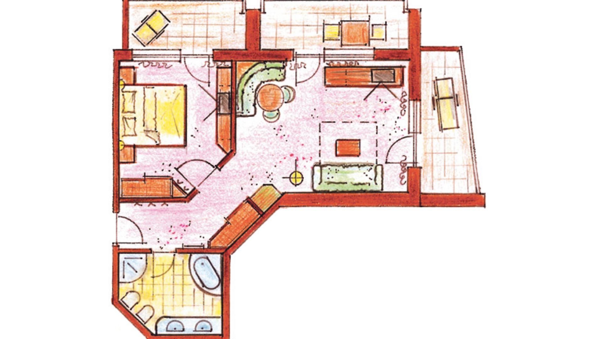 Approx. 40m² elegant double room with sliding door to the lounge with sofa bed, minibar, some with whirlpool and...